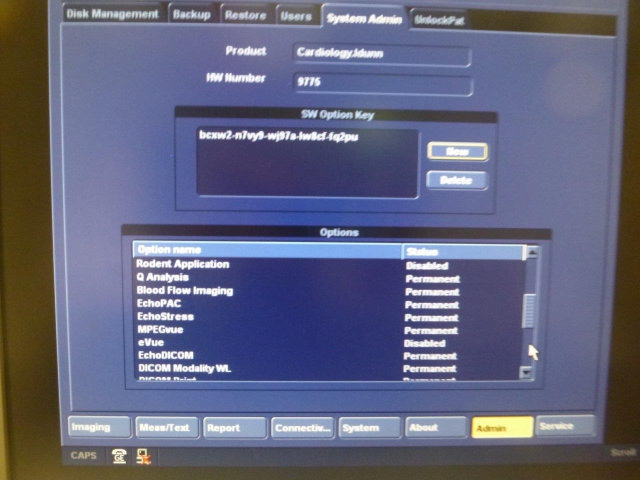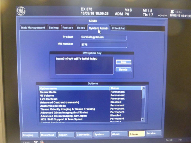 Installed Options: DICOM Media, 4D Volume, LVO Contrast, Tissue Velocity Imaging & Tissue Tracking, Anatomical M Mode, Advanced QScan imaging, M3S/M4S Support & True Speed, Q Analysis, Blood Flow Imaging, EchoPAC, EchoStress, MPEGvue, Echo DICOM, DICOM Modality W/L, DICOM Print, , Advanced QScan imaging (incl TSI), Multi-dimensional Imaging (incl Bi-plane), Bi-plane imaging, 4D LV Volume, Automated Functional Imaging, Vivid 7 Dimension