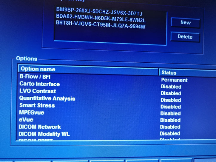 Installed Options: Cardiac Application, Virtual Convex, LOGIQView, TEE, Vascular Application, B-Flow/BFI