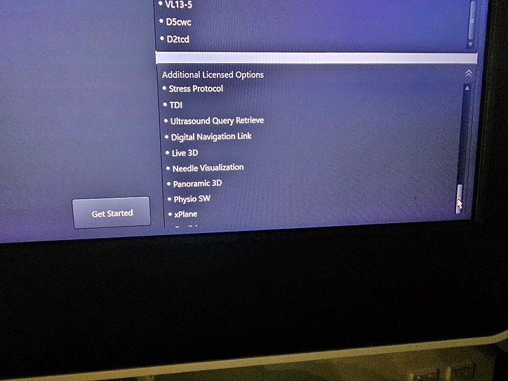 Installed options: Abdomen, Adult Cardiology, Breast, Fetal Echo, Small Parts, OB, GYN, MSK, Interventional GI, Pediatric Cardiology, Vascular, TCD, Urology, xMatrix Performance, Anatomical M Mode, Auto Doppler, AutoScan, Battery SW, Contrast Cardiac, Freehand3D, HighQ, MaxVue, Multi Modality Query Retrieve, Netlink DICOM, OmniSphere Connectivity, Panoramic 2D, SmartExam, Stress Protocol, TDI, Ultrasound Query Retrieve, Digital Navigation Link, Live 3D, Needle Visualization, Panoramic 3D, Physio SW, xPlane