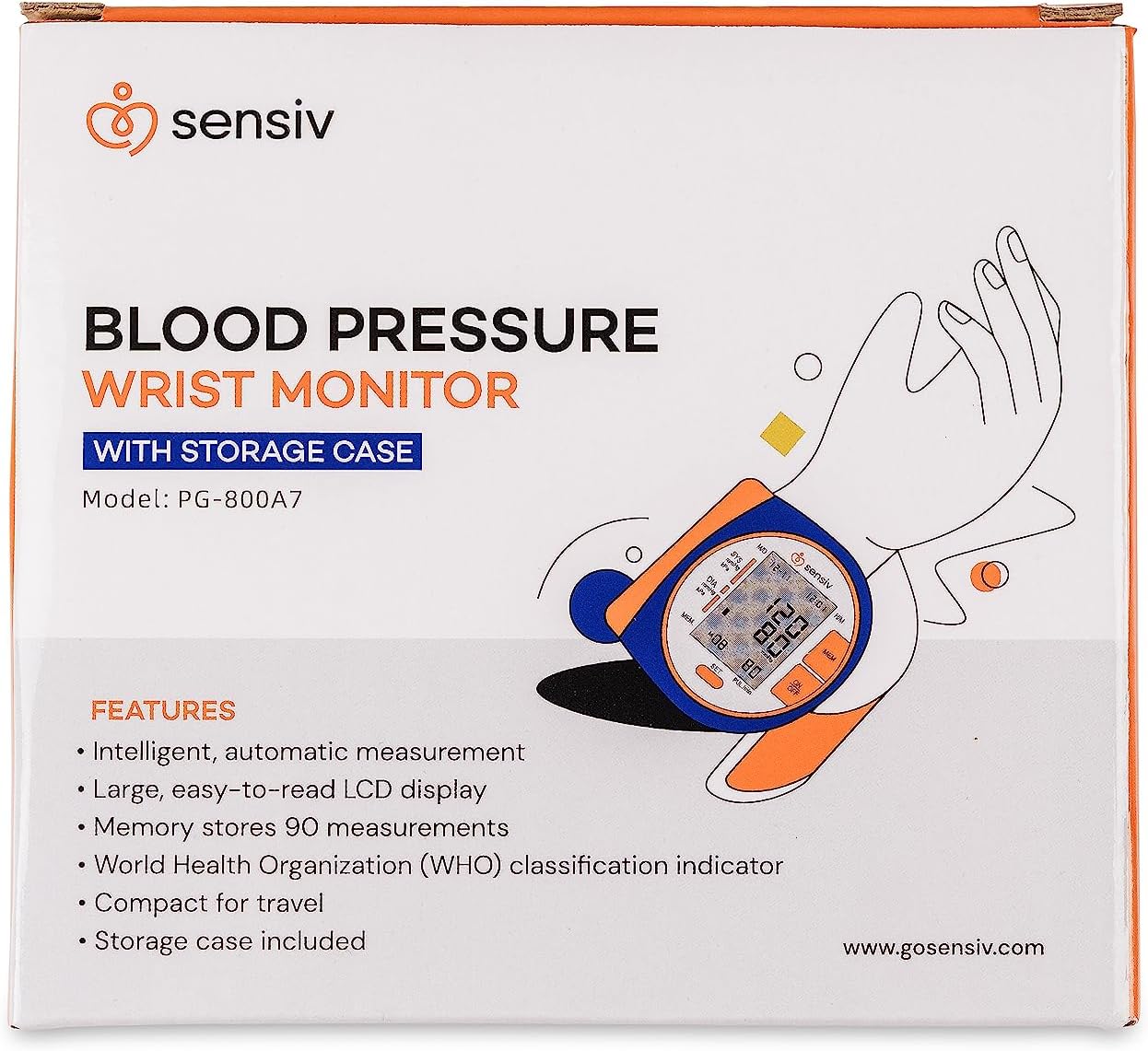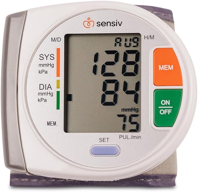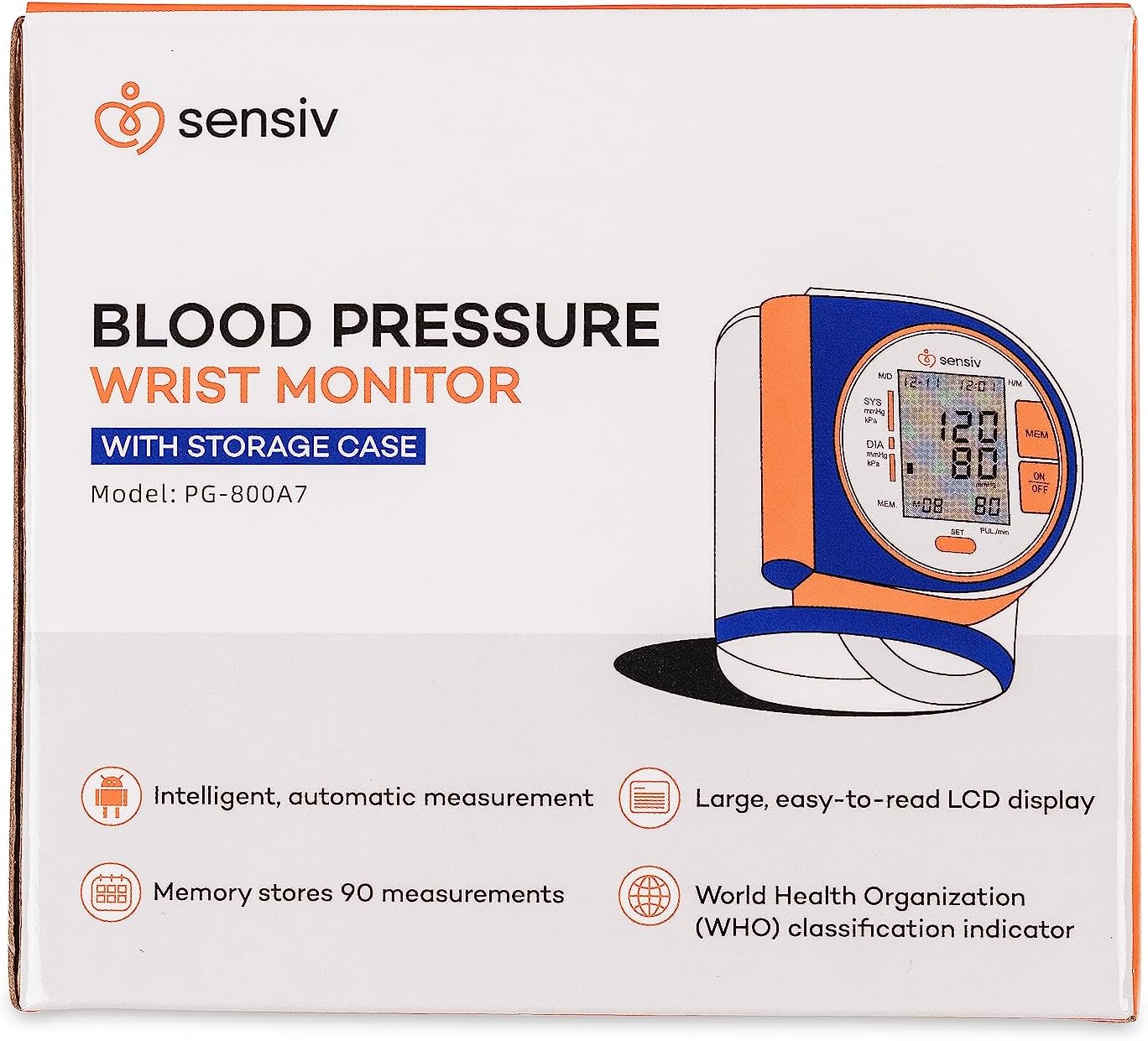 Track your blood pressure at home with the Sensiv Wrist Blood Pressure Monitor. The large display is easy to read and minimal buttons make it simple to use. The Monitor’s memory can store up to 90 previous readings for convenient comparison. This compact Monitor comes with a storage case and tucks easily in a bag for travel.